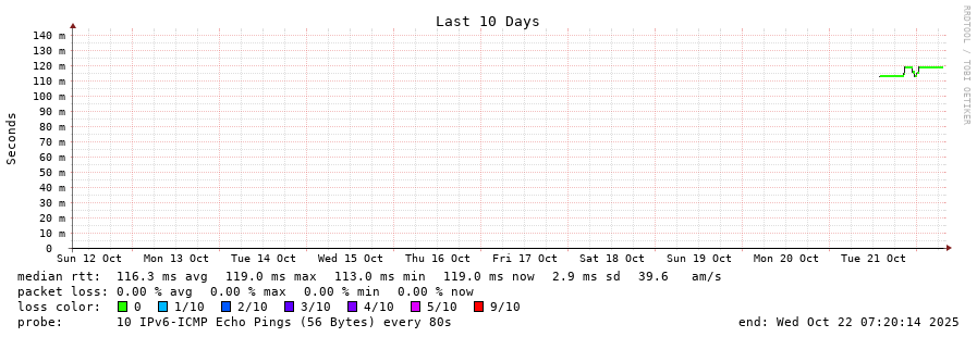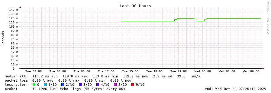 14 > 2a02:2f00:8708::e7 (2a02:2f00:8708::e7) [AS8708] 109.968ms 110.029ms 110.012ms