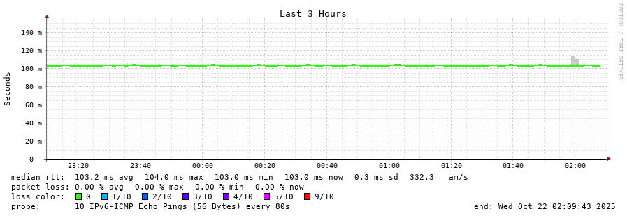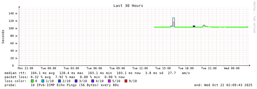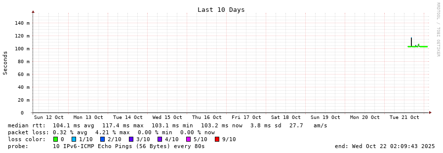 traceroute to 2a00:c30:bbbb:d::2 (2a00:c30:bbbb:d::2), 30 hops max, 80 byte packets - Generated at 2025-10-21 18:15:02